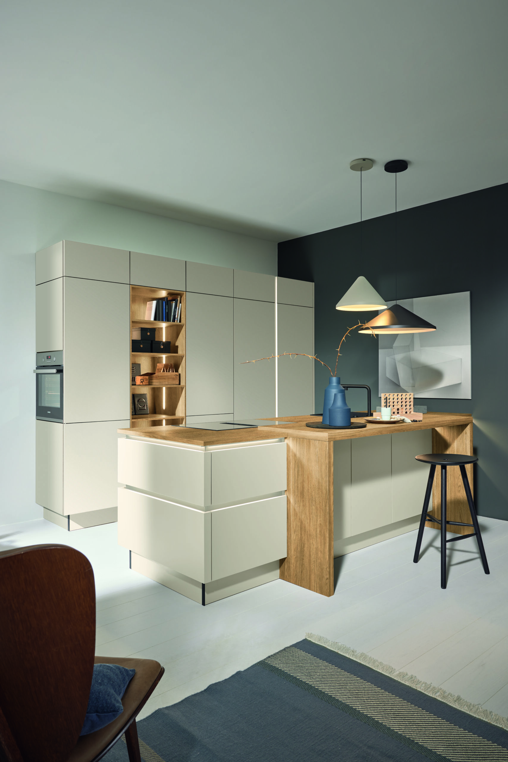 Designed to blend seamlessly with the kitchen front, these handles create sophisticated tone-on-tone compositions or striking visual contrasts. Available in a wide range of matte finishes, they bring harmony and precision to every detail of the design.