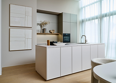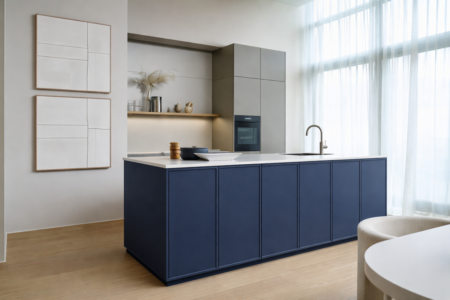 The kitchens were designed with a true handleless concept, while later phases introduced the VELLUTO Anti-Fingerprint range to maintain a refined and flawless appearance in everyday use. The result is a seamless integration between architecture, functionality, and contemporary living aesthetics.
